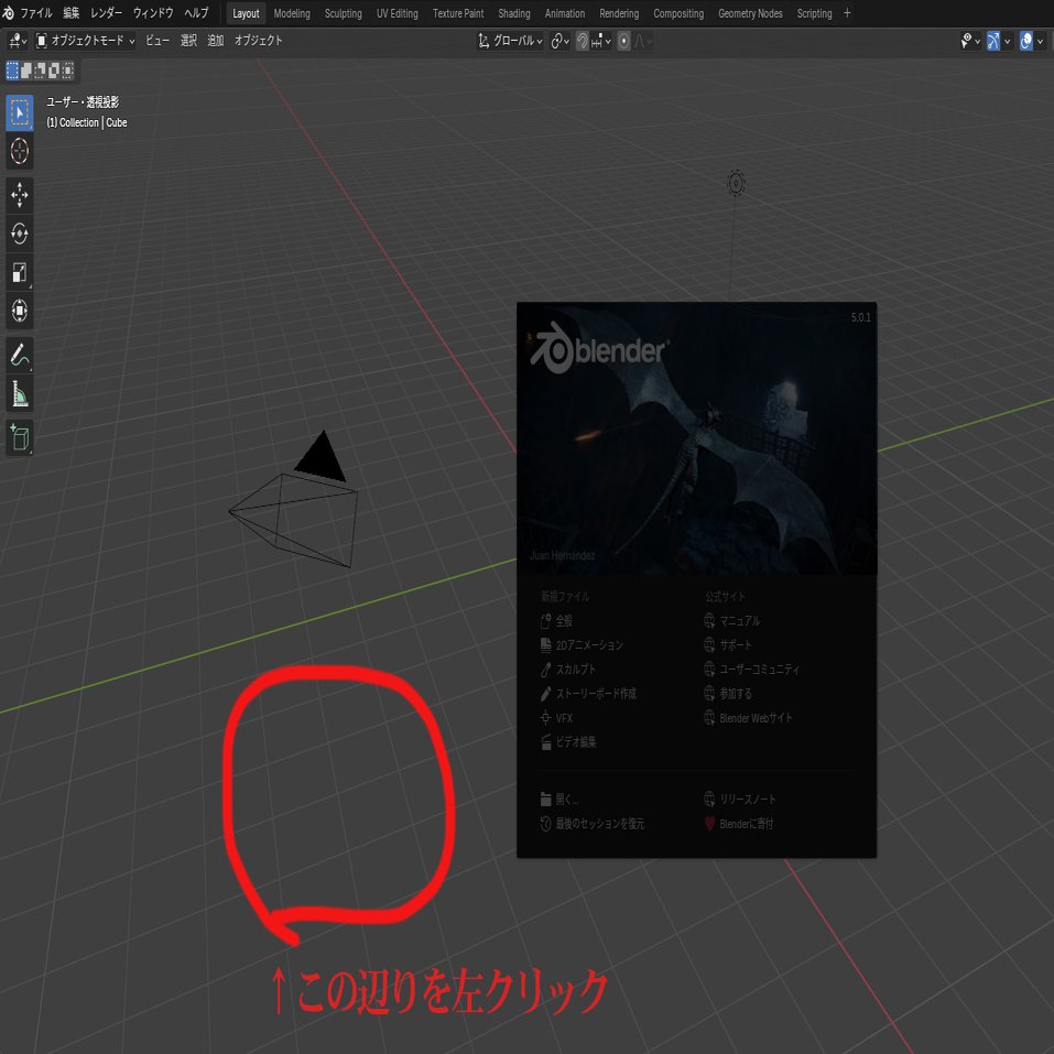 Blenderと表示されている画面以外をクリックすれば大丈夫です