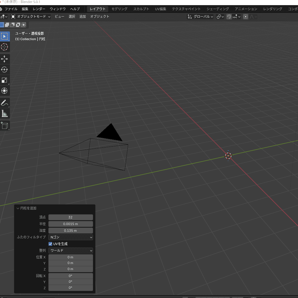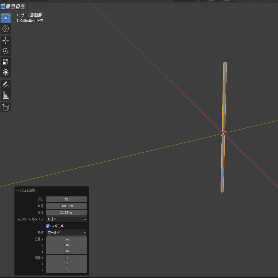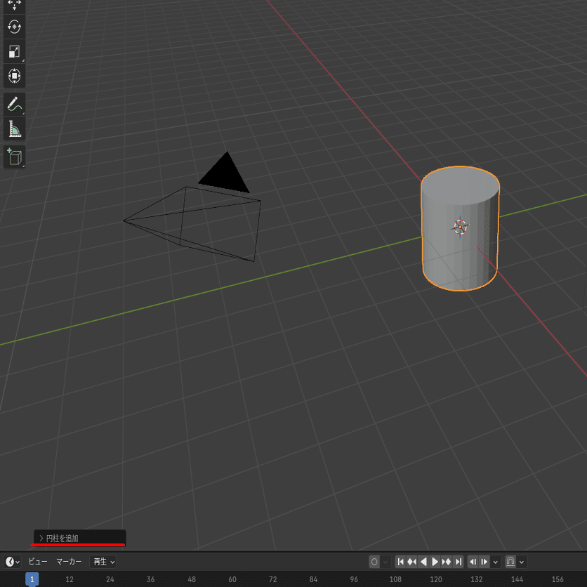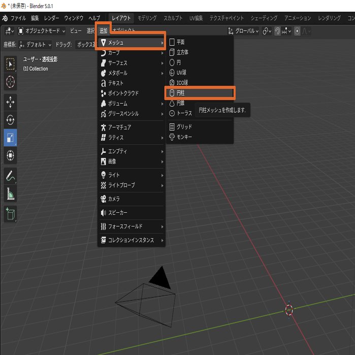 下図の場所、追加 > メッシュ > 円柱 をクリック