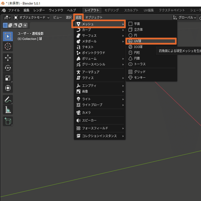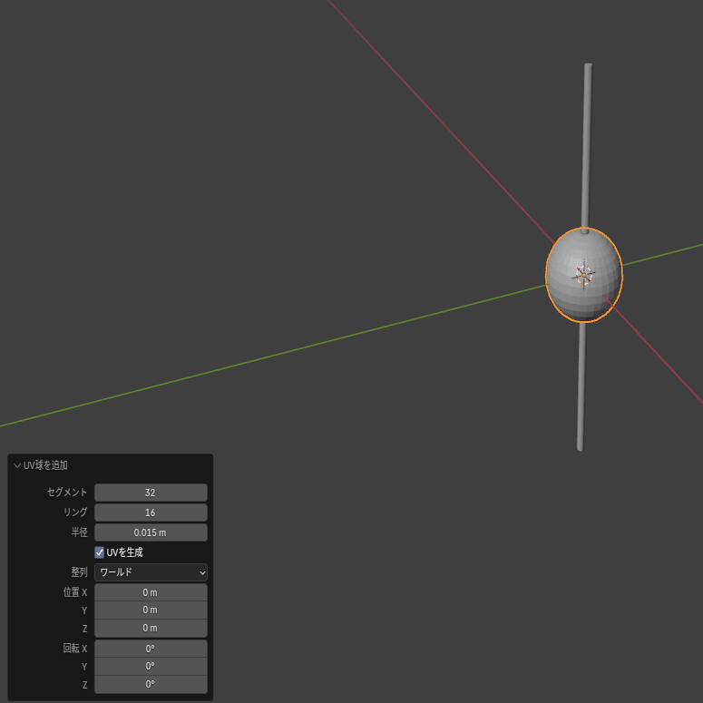 球体が作成出来たら、左下のUV球を追加をクリックし、数値を入力します。