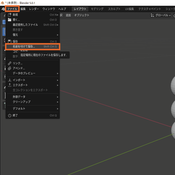 次回に使用しますので、データを保存しておいてください。ファイル > 名前を付けて保存をクリック
